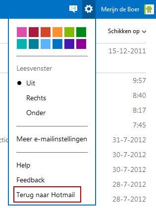 Is het je allemaal té hip of ben je gewoon ontevreden over het nieuwe uiterlijk dan ga je gemakkelijk terug naar de oude interface. Klik hiervoor op het tandwieltje en kies ‘Terug naar Hotmail’. Alles is dan weer bij het oude.