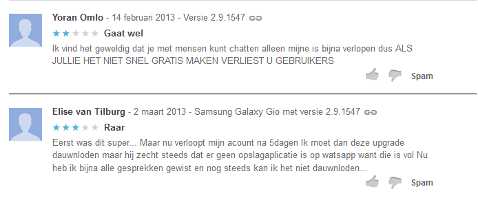 Op de pagina van WhatsApp in Google Play regent het momenteel boze reacties en meldingen over het verlopen van WhatsApp-abonnementen. Gebruikers stellen dat ze ineens moeten updaten en € 0,89 moeten betalen voor de applicatie. Bij de één wordt het lidmaatschap automatisch voor een jaar verlengd, de ander krijgt weer de melding dat over 4 maanden moet worden betaald.