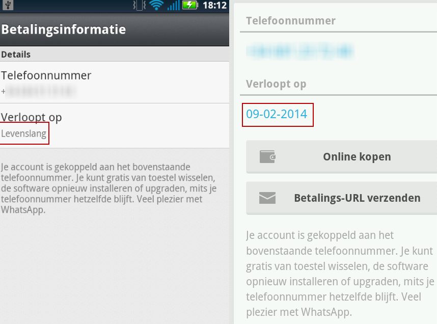 Het is uiteraard balen wanneer je denkt gratis te kunnen sms’en en ineens ziet dat je moet betalen (al is € 0,89 weinig geld). Wacht echter nog even met op hol slaan, want in veel gevallen krijg je gratis een jaar erbij. Zowel Rutger als ikzelf gebruiken de app al meer dan 3 jaar en wij hebben geen problemen gezien. Check de screenshots voor onze huidige abonnementen: die van Rutger is net met een jaar verlengd en die van mij staat op de status ‘Levenslang’.