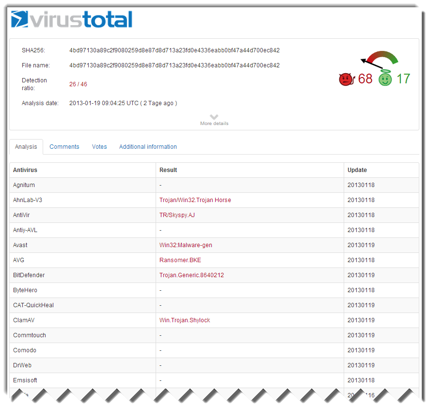 Momenteel herkennen niet alle virusscanners het probleem. Kaspersky Antivirus bijvoorbeeld is nog in afwachting van een benodigde update. Website VirusTotal houdt een lijst bij met antivirussoftware die het gevaar wél herkent en verbant. De lijst wordt voortdurend ververst. Houd die dus in de gaten als je geen slachtoffer wilt worden van de Shylock Trojan.