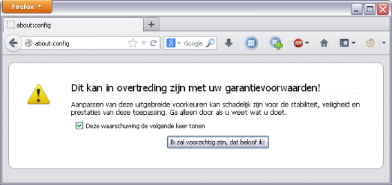 1. Typ about:config in de adresbalk