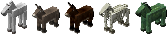 Naast gewone paarden heb je een aantal andere paardachtigen in Minecraft. Zo heb je het veulen, wat uiteindelijk uitgroeit tot een volwassen paard. Ook zijn er ezels, deze kun je bepakken met chests (kisten). Fok je een ezel met een paard, dan krijg je een muilezel. Deze kun je tevens gebruiken voor het vervoeren van goederen. Minecraft zou Minecraft niet zijn als er geen zombiepaarden zouden zijn. Deze kun je niet temmen, net als de laatste in dit rijtje, het skeletpaard. Het zombie- en skeletpaard zijn waarschijnlijk ingevoerd om in een latere update te dienen als vijanden.