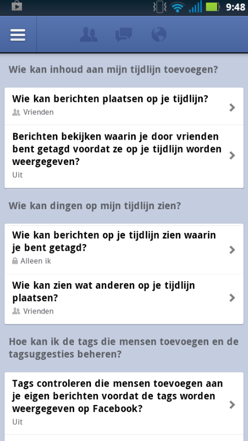 Tot slot geef je aan of je tags die door anderen in jouw berichten worden geplaatst wilt controleren en of getagde berichten te zien zijn voor specifieke mensen of aangemaakte lijsten van vrienden.