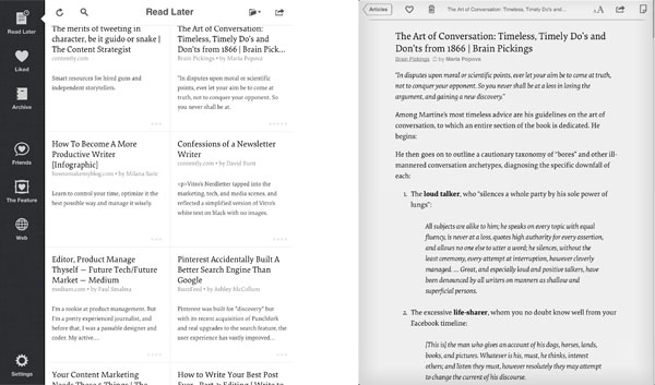 Daarnaast hebben veel RSS-readers of apps als Flipboard een knop waarmee je artikelen naar Instapaper verstuurt, wat de app nog praktischer maakt als opslagplaats voor alle interessante artikelen die je tegenkomt.