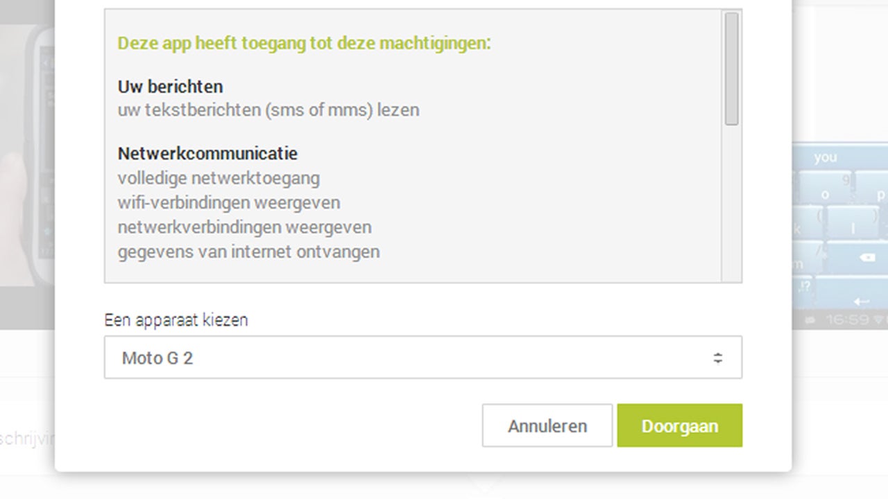 In het pop up-scherm ga je akkoord met de voorwaarden en kies je het Android-apparaat dat aan je account is gekoppeld, in dit geval de Motorola Moto G.