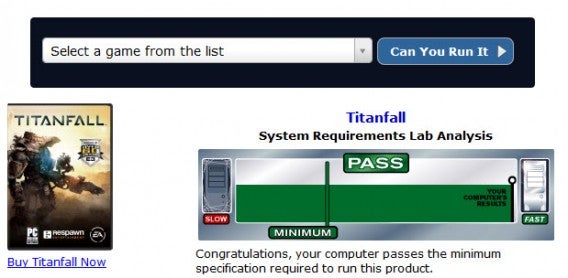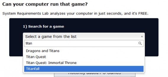 Log in op Can You Run It? en selecteer uit de lijst het spel dat je wilt. De simpelste manier is om te beginnen met typen van de naam en te wachten tot de website suggesties geeft. In dit voorbeeld kijken we naar Titanfall.