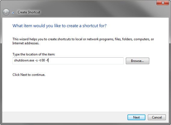 Windows kan je pc snel en direct uitschakelen, zonder rekening te houden met programma’s die nog openstaan. Om dit te doen klik je met de rechtermuisknop op het bureaublad en kies je Nieuw > Snelkoppeling. Typ in het venster de volgende code: shutdown.exe-s -t 00-f.