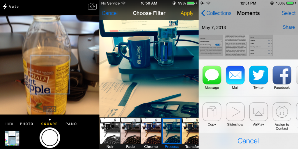De applicatie voor de ingebouwde camera is aangepast en heeft een nieuwe interface plus een aantal toevoegingen. Je wisselt nu snel tussen video, foto, panorama en het maken van vierkante foto’s á la Instagram. Nadat je een foto neemt ga je snel naar je filmrol, waar je een nieuwe lay-out plus de nodige bewerkingsopties vindt. Foto’s zijn nu ingedeeld op datum, waarbij je in- en uitzoomt van momenten tot collecties tot hele jaren. Sorteer je liever foto’s op locatie, dan kan dat ook in iOS 7.