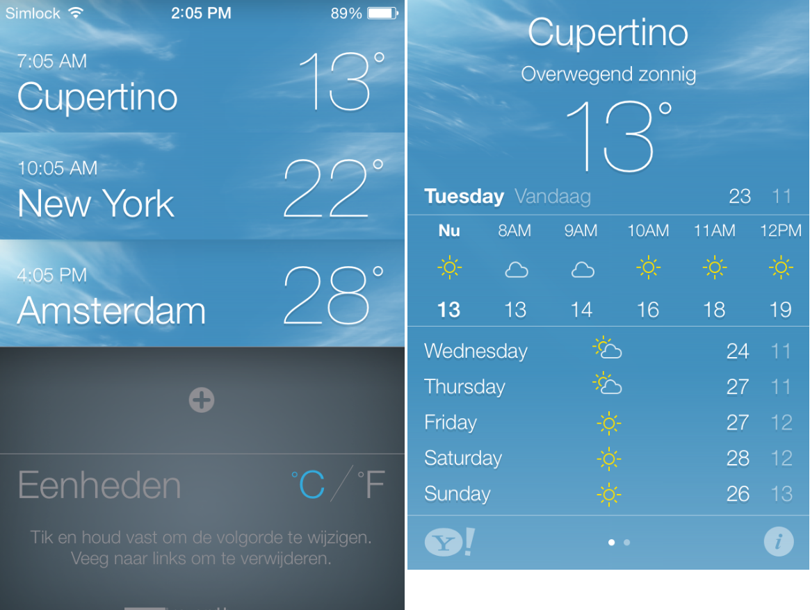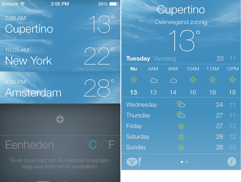 Ook de weer-app van iOS is flink op de schop genomen. Het toont een voorspelling per uur of per dag en, als je op de temperatuur tikt, de luchtvochtigheid, kans op regen en windsnelheid. Door links en rechts te vegen schakel je tussen opgeslagen locaties. Door met twee vingers op het scherm een knijpbeweging te maken zoom je uit naar je locatieoverzicht, waar je alle plekken herindeelt, nieuwe toevoegt, of schakelt tussen Celsius en Fahrenheit. Alle verbeteringen komen in ons oude kikkerlandje natuurlijk goed van pas en met de toegevoegde informatie weet je altijd wat je mag verwachten als je de deur uitstapt.
