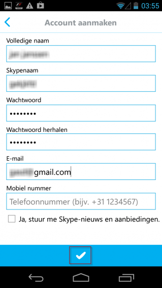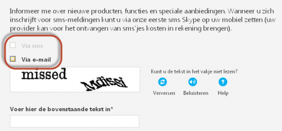 4. Tenzij je nieuws en aanbiedingen van Skype wilt ontvangen, vink de twee vakken dan vooral niet aan.