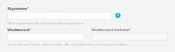 3. Accepteer de gebruiksvoorwaarden (na ze te hebben gelezen!) en vul vervolgens alle velden in. Hier kies je ook je Skype-naam en het wachtwoord dat je gaat gebruiken om in te loggen.