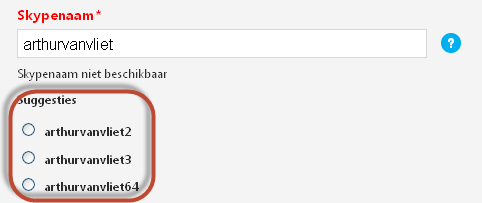 Als de naam die je hebt gekozen al in gebruik is door iemand anders, dan moet je een alternatief bedenken. Skype zal zelf een aantal suggesties doen, maar je bent uiteraard vrij om er zelf één te bedenken.