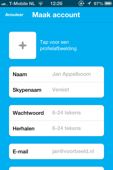 4. Vul alle velden in. Hier kies je ook je Skype-naam en het wachtwoord dat je gaat gebruiken om in te loggen in de toekomst. Ook voer je hier een afbeelding in die gaat dienen als profielfoto. Tik onderin op Maak account.