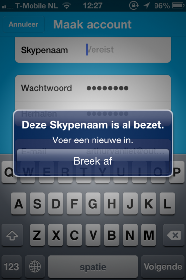 Tik op Breek af en vul een andere in. Je account is aangemaakt!