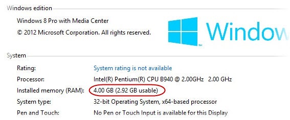 32-bits-Windows gebruikt maximaal 3 gigabytes RAM, ook al heeft je computer meer.