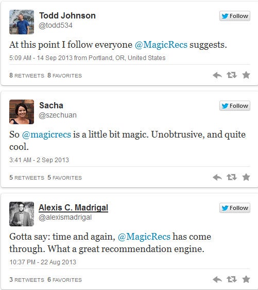 @MagicRecs geeft ook suggesties voor populaire Twitteraars die aansluiten bij andere personen of accounts die jij volgt. Twitter werkt aan het perfectioneren van de suggesties, maar ziet @MagicRecs op dit moment nog als een experiment. Volgens het bedrijf is een groot aantal gebruikers al zeer tevreden over de nieuwe functie.
