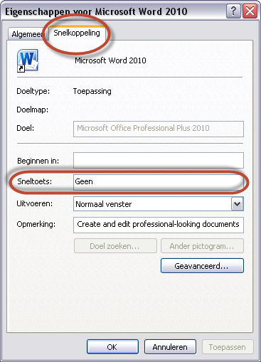 Klik in het eigenschappenmenu op het tabblad ‘Snelkoppeling’. Hier vind je het veld ‘Sneltoets’. Klik in dat veld met je muis.